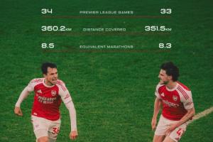体育资讯04月27日讯 阿森纳官方晒出一组数据图,阿森纳中场二人组苏维门迪和赖斯本赛季英超跑动距离相当于跑八次全马。