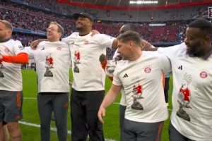 今天凌晨,拜仁4-2击败斯图加特,将队史第35座联赛冠军完美收入囊中。赛后,安联球场内洋溢着狂欢的气氛,而主角是一件极其特别的纪念衫。