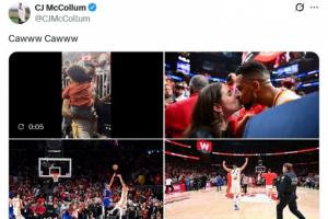 赛后,老鹰后卫CJ·麦科勒姆更新社媒,晒出自己抱着孩子的视频以及亲吻妻子、投出准绝杀中投,还有赛后庆祝的照片。